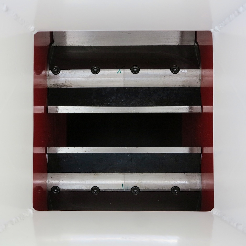 Der Trichter ist lang genug, um die Sicherheit zu gewährleisten und ist mit einem Sicherheitsschalterrahmen ausgestattet. Wenn der Auslöserahmen gedrückt wird, stoppt der Motor. Der Trichter befindet sich horizontal, was das Einführen von langen Ästen im Vergleich zum senkrechten oder schrägen Trichter wesentlich erleichtert. Die Oberflächenbehandlung der gesamten Maschine wird mit Pulverfarbe ausgeführt.