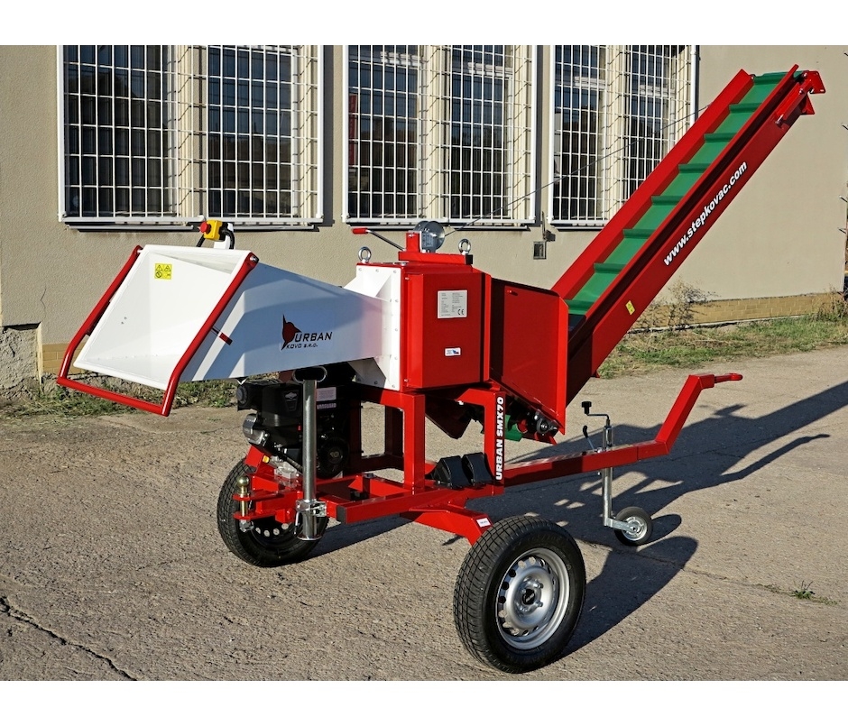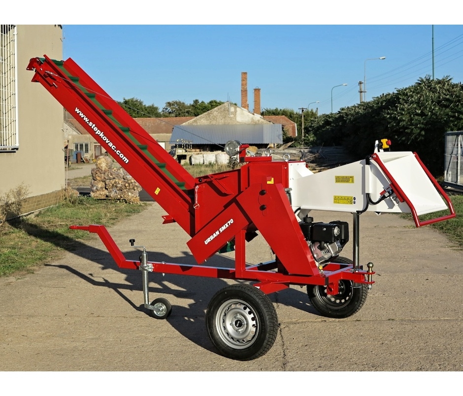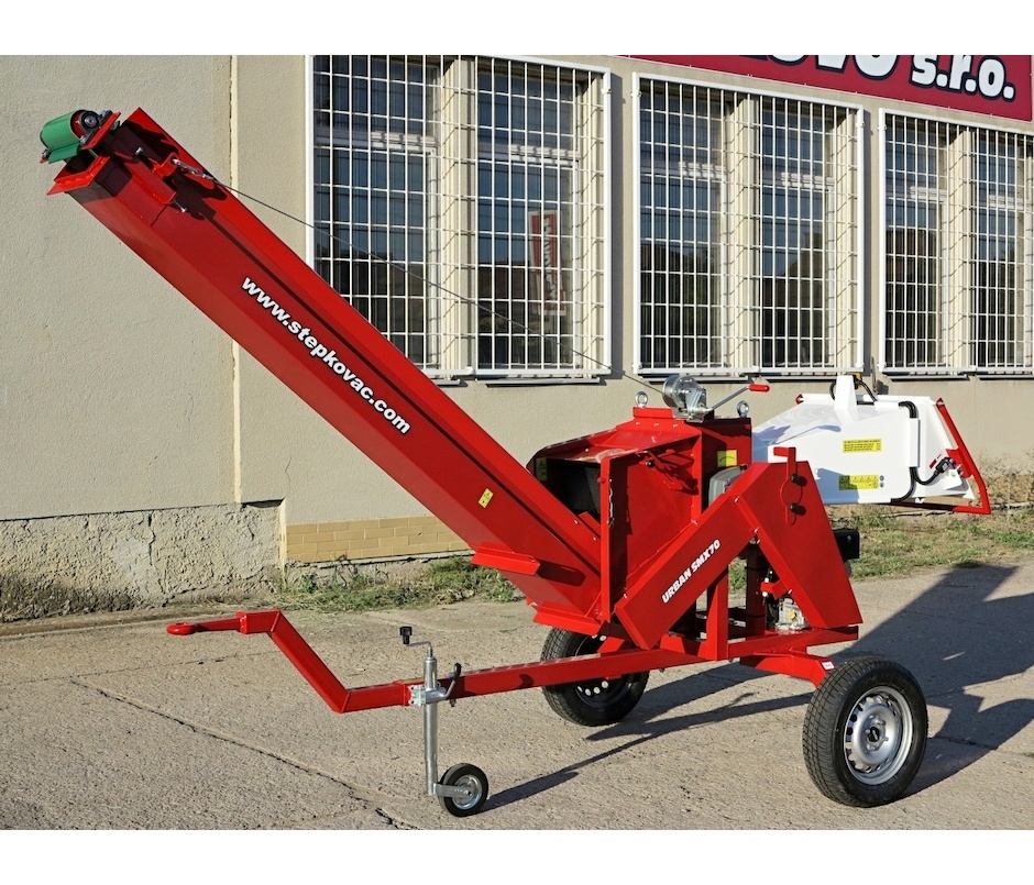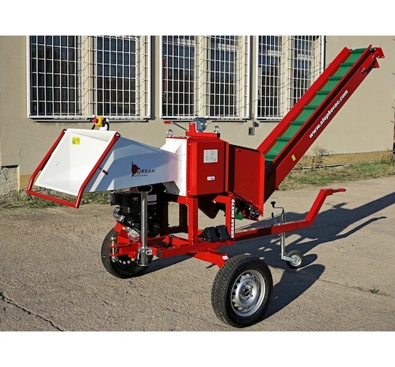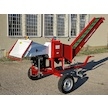 Das Hackgut wird von einem 2.6 m Bandförderer gefördert. Die Neigung des Förderers ist mittels einer Winde verstellbar. Beim Transport ist der Förderer in eine senkrechte Position angehoben. Als optionales Zubehör ist es möglich, am Ende des Förderers eine 0,8 m lange Rutsche (das Hackgut von der Rutsche fällt in dem fernen Platz) oder eine Doppelvorrichtung für Netzsäcke mit einem Stützbein zu anbringen. Die Vorrichtung ist mit vier verbunden Schrauben befestigt und Montage dauert nur wenige Minuten.